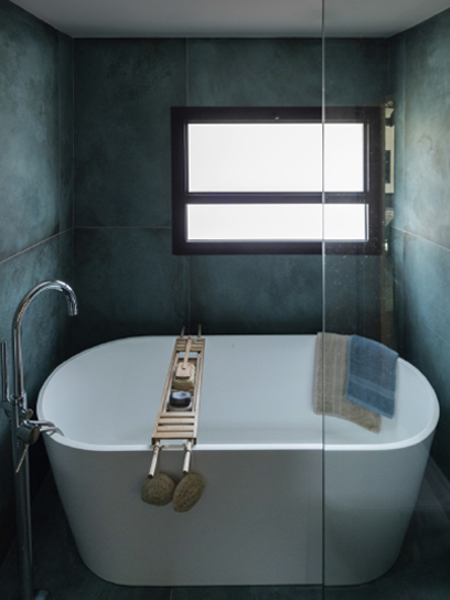 The main 27 sq m space can be divided as needed by glass sliding partitions and centers on a round bed (⌀2.65 m with ⌀2.2 m mattress), which is in itself a “place”. Across from the round bed are two sleeper armchairs that convert into orthopedic single beds. Also in the loft is a spacious 15 sq m dining area with a 3.5 m long dining table that can seat up to 13 people. The library area (18 sq m) serves as an alternative lounge and is furnished with a comfortable orthopedic sofa bed. In all, this suite sleeps up to six people. In the lavish bathroom (4.5 sq m) you will find a free-standing bathtub, and there is an additional toilet room (1.5 sq m). The villa’s bar-kitchen (20 sq m) and the pergola-shaded patio (18 sq m) are an integral part of the loft’s flowing space.
